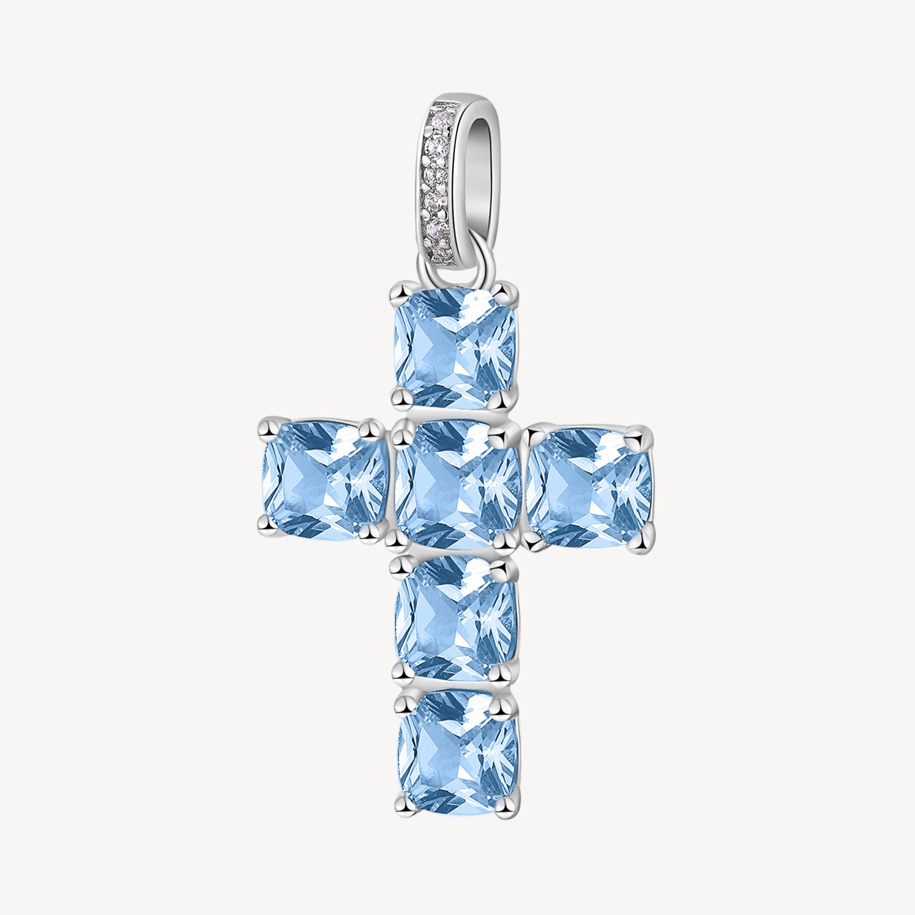 Pendente a forma di croce in argento rodiato 925‰ con cushion cubic zirconia colore light sapphire.