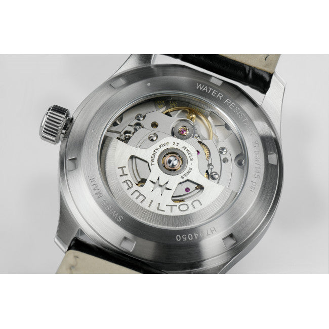Movimento a tre sfere con data e riserva di carica superiore di 80 ore, l'H-10 presenta elaborati motivi colimaçon e perlati a contrasto per i modelli American Classic e superfici pulite per gli orologi da pilota.