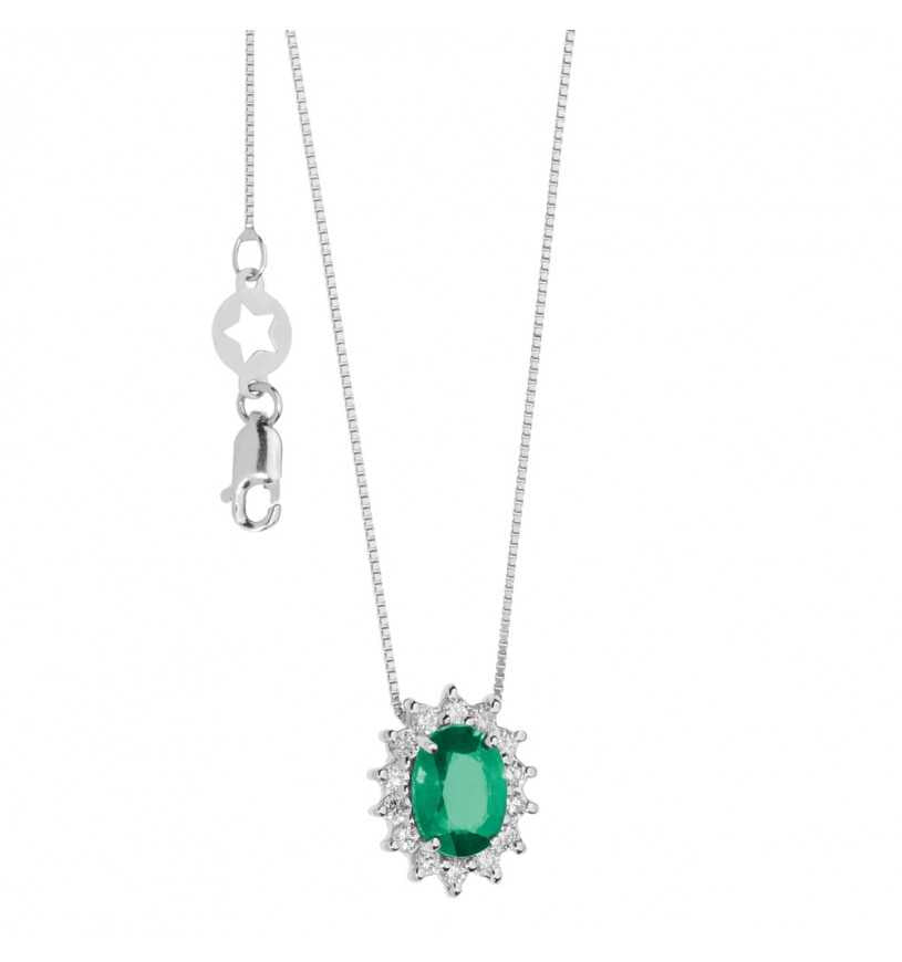 Girocollo in Oro 750‰. Diamanti bianchi P.Ct.21 Col. G Purezza SI. Smeraldo ovale 5x7 Ct.0,70