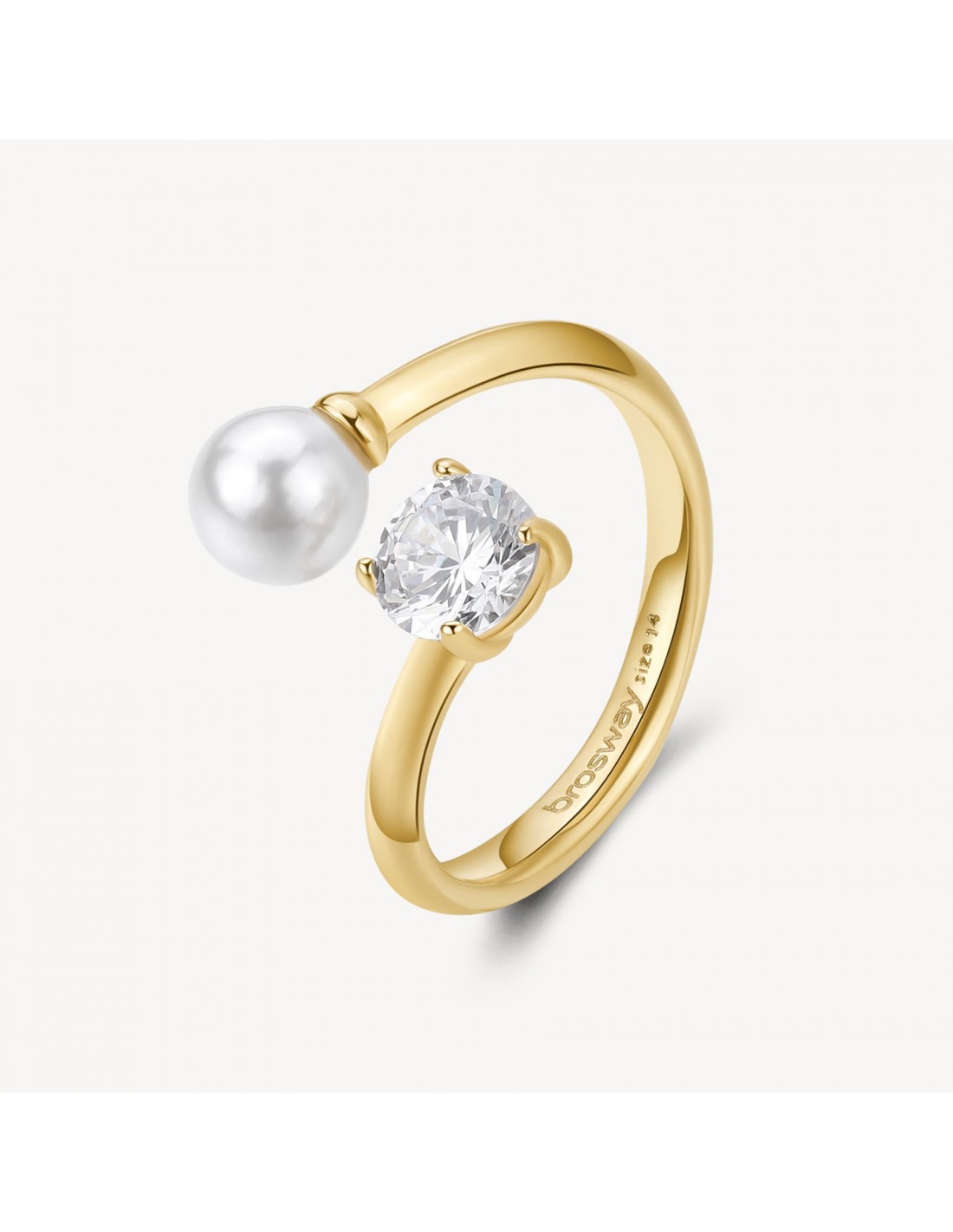 Anello di Brosway della collezione Affinity. Gioiello da donna in acciaio 316L, finitura pvd colore oro, perla di conchiglia e cubic zirconia. Misura: regolabile da 12 a 16. La referenza è: BFF191B.