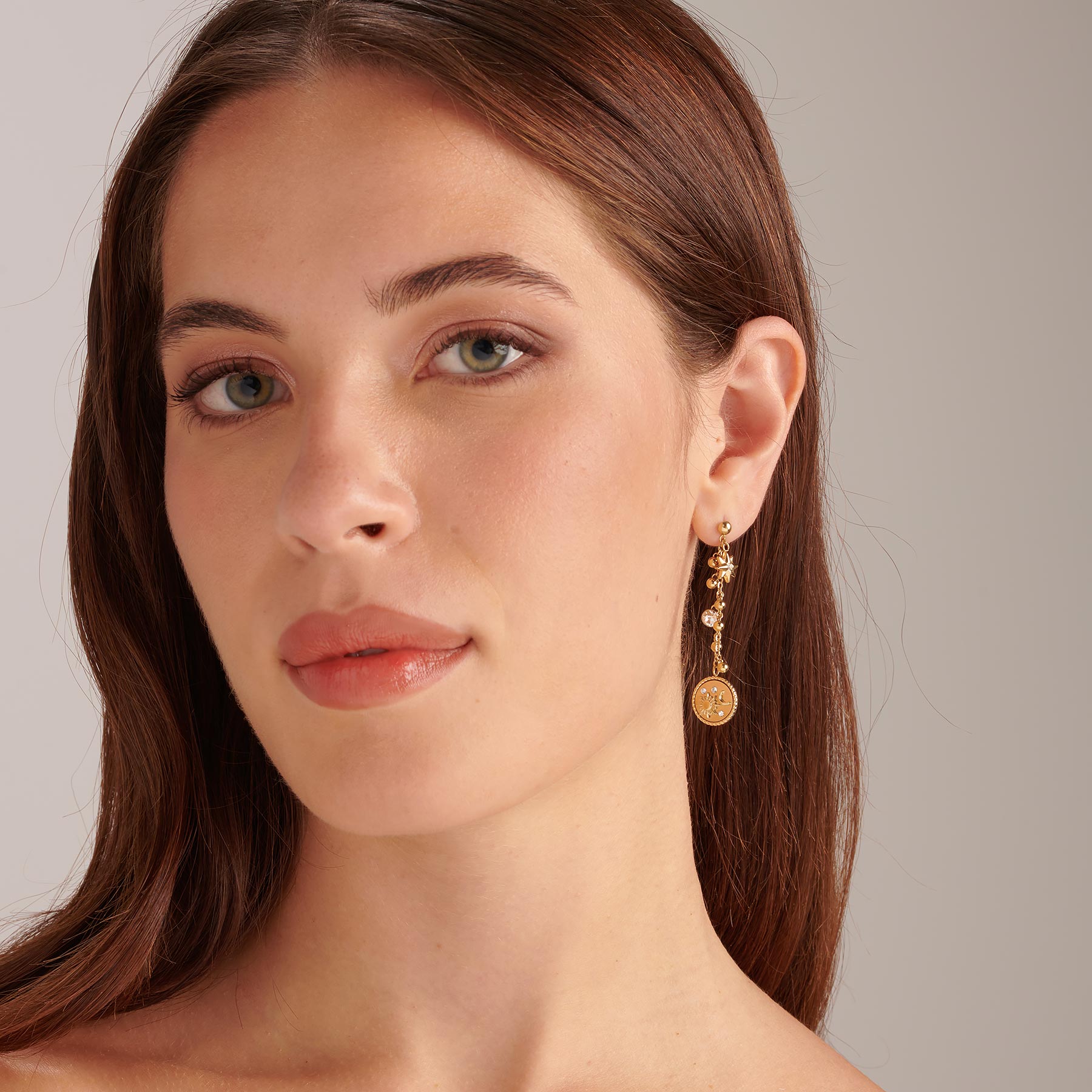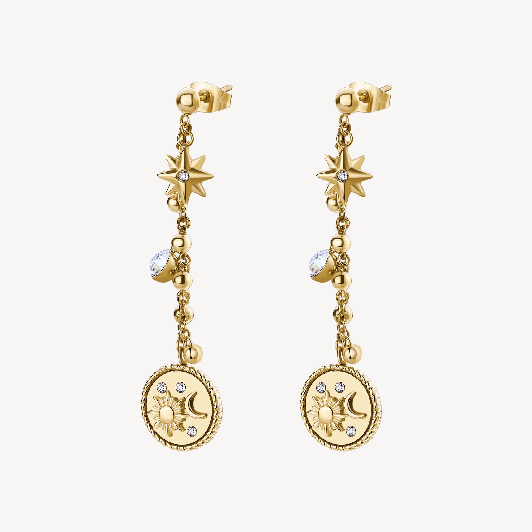 Orecchini di Brosway della collezione Chakra. Gioiello da donna in acciaio 316L, finitura pvd colore oro e simbolo sole e luna