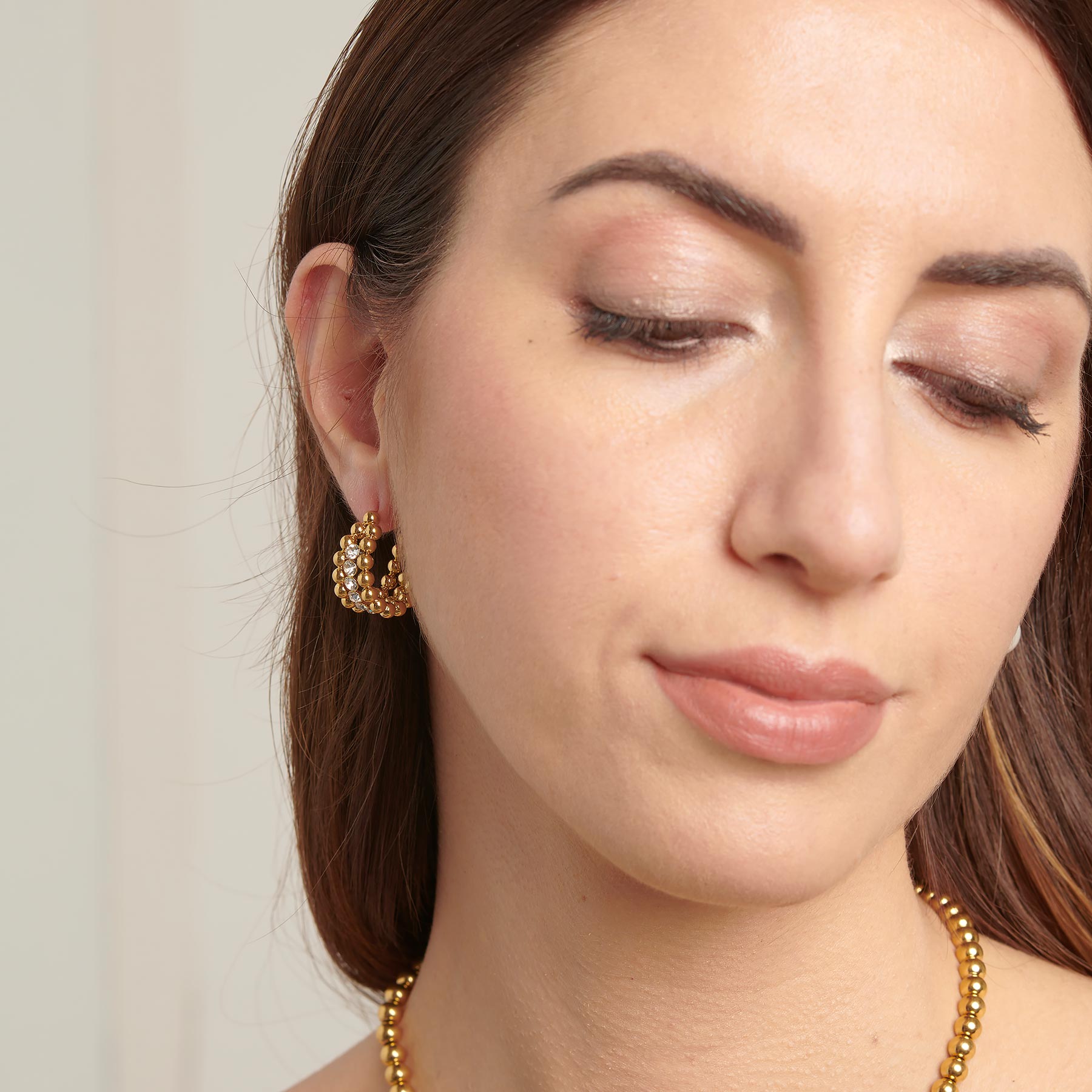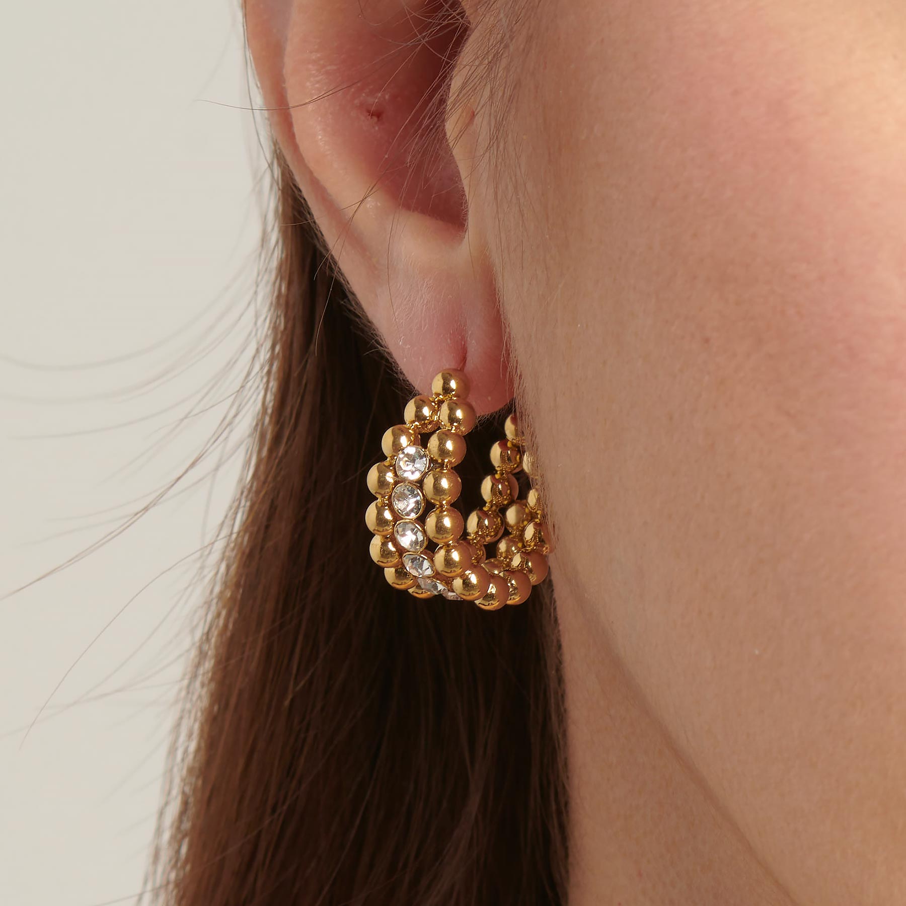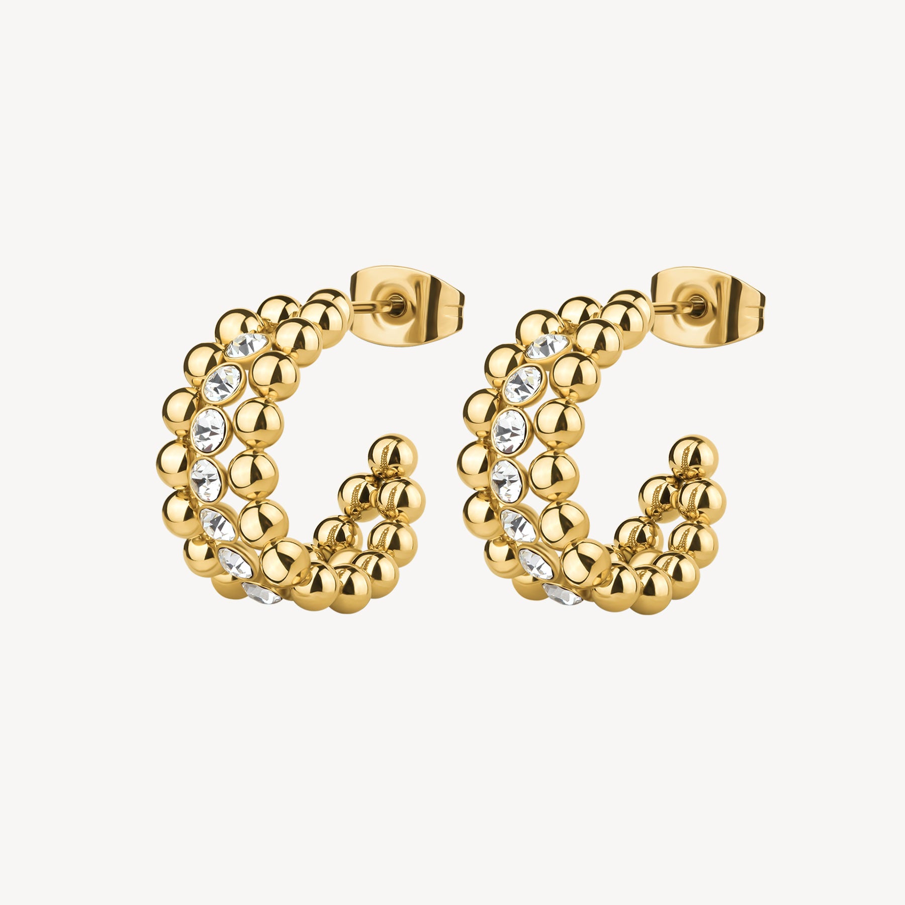 Orecchini a cerchio in acciaio 316L e finitura pvd oro 14K con cristalli.