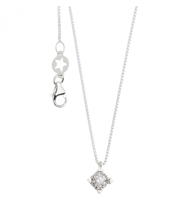 Punto luce da donna realizzato con catena veneziana in oro 18kt; pendente dalle dimensioni di 7,08 mm x 7,02 mm x 3,66 mm con diamante bianco con punto di caratura 20, colore G e purezza SI.