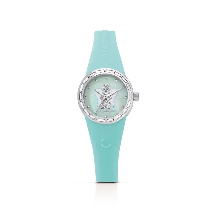 Orologio Angelo con cassa "mini" in acciaio, cinturino azzurro e quadrante azzurro in madreperla.