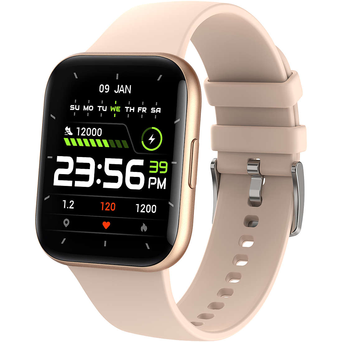 Smartwatch da donna di Smarty. La cassa è rettangolare realizzata in alloy di color rosa e di dimensione 44 mm. Il cinturino realizzato in silicone di colore rosa con fibbia ad ardiglione. Ha un display touch digitale e supporta i sistemi: android 4. 4/apple superiore a ios 8. 0. Il tempo di standby è di 30 giorni, il normale uso 5-7 giorni. Funzioni benessere: controllo del sonno, benessere generale, cardio frequenza, anti stress, test cardio programma, test pressione programma, ossigeno e pressione sanguinea. Funzioni sport: contapassi distanza, consumo calorie, promemoria sedentario, meteo, promemoria consumo acqua, rileva percorso, misuratore battiti per minuto, tempo (bpm / cal / tempo). Funzioni orologio: sveglia, accensione schermo con rotazione polso, foto personalizzate, cambio sfondo schermo, luminosità schermo, cronografo e monitor a scorrimento, seleziona lingua. Funzioni smartphone: trova orologio, notifica messaggi e chiamate, controllo della musica, chiamata blu etooth e telecomando foto selfie. La referenza è sw033cQuesto Smartwatch verrà spedito con Scatola Originale Smarty