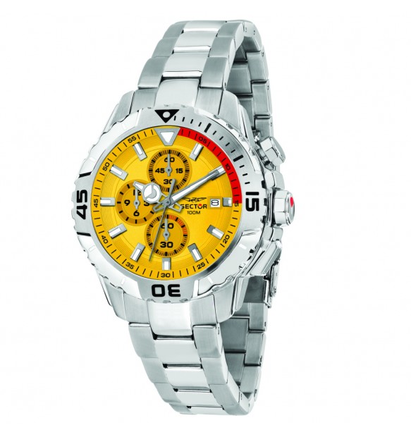 Quadrante analogico giallo con indici a bastoni super luminous, logo nella parte alta e datario a ore 3.