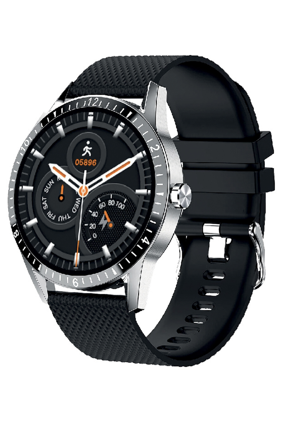 • Smartwatch multifunzione touchscreen con cassa tonda in abs e cinturino in silicone di colore nero con chiusura a fibbia ad ardiglione. dimensione 260 x 42 x 12 mm caratteristiche sistema android 4.4/apple superiore a ios 8.0 valutazione impermeabilità ip68 (protetto da polvere e resistente a brevi immersioni 1.5 m per 30min.) caricatore ricarica diretta usb tempo di standby 30 giorni, il normale uso 5/7 giorni. funzioni benessere promemoria ciclo fisiologico/ovulazione, controllo del sonno, cardio frequenza, ossigeno e pressione sanguigna. funzioni sport contapassi distanza, consumo calorie, meteo, promemoria sedentario, rilevatore di percorso e misuratore battiti. funzioni smartphone trova orologio, notifica sms e chiamata, controllo musica, antiabbandono smartphone e telecomando foto selfie. funzioni orologio sveglia, rotazione schermo polso, cambio sfondo schermo, luminosità, cronografo, scorrimento monitor, timer, foto personalizzate fino a 5 quadranti.