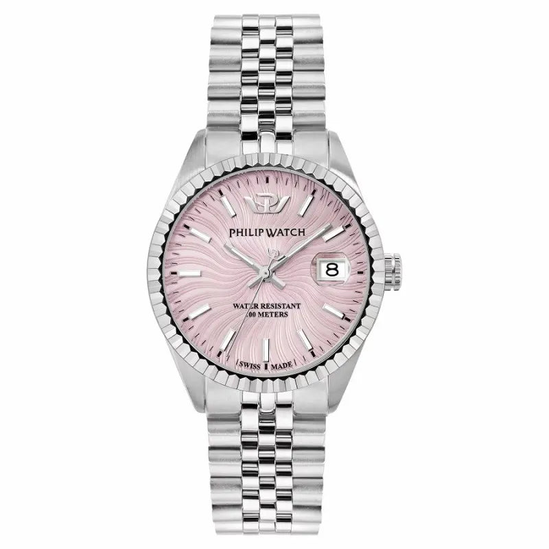 Orologio PHILIP WATCH solo tempo da Donna della collezione CARIBE URBAN con movimento SWISS MADE al quarzo, cassa 35 mm in acciaio inox, lunetta con finitura zigrinata, spessore della cassa 9.15 mm, quadrante analogico rosa con sfumature ad onda, datario a finestrella con lente d’ingrandimento ad ore 3, indici a bastoni e lancette con inserto luminescente in modo che l'ora sia leggibile anche in condizioni di scarsa illuminazione, fondello serrato a vite per una maggiore garanzia di impermeabilità e vetro zaffiro con trattamento antiriflesso - Il cinturino è in acciaio inox finitura lucida e satinata e monta una chiusura déployante con apertura a doppio pulsante e blocco di sicurezza - Orologio impermeabile a 10 ATM.